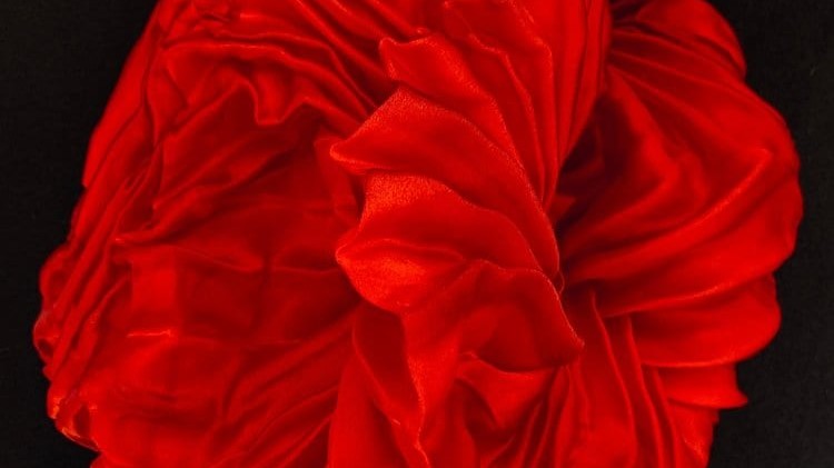 My technique includes multiple degrees of folding and crimping the fabric. It can involve one or two color combinations to complete the second part of the process. When completed, I manipulate the fabric to create its form, then sewing it in place. I came to this process through years of experimentation, research and development. It can take anywhere from two days to a week or more to complete a piece or series of pieces.