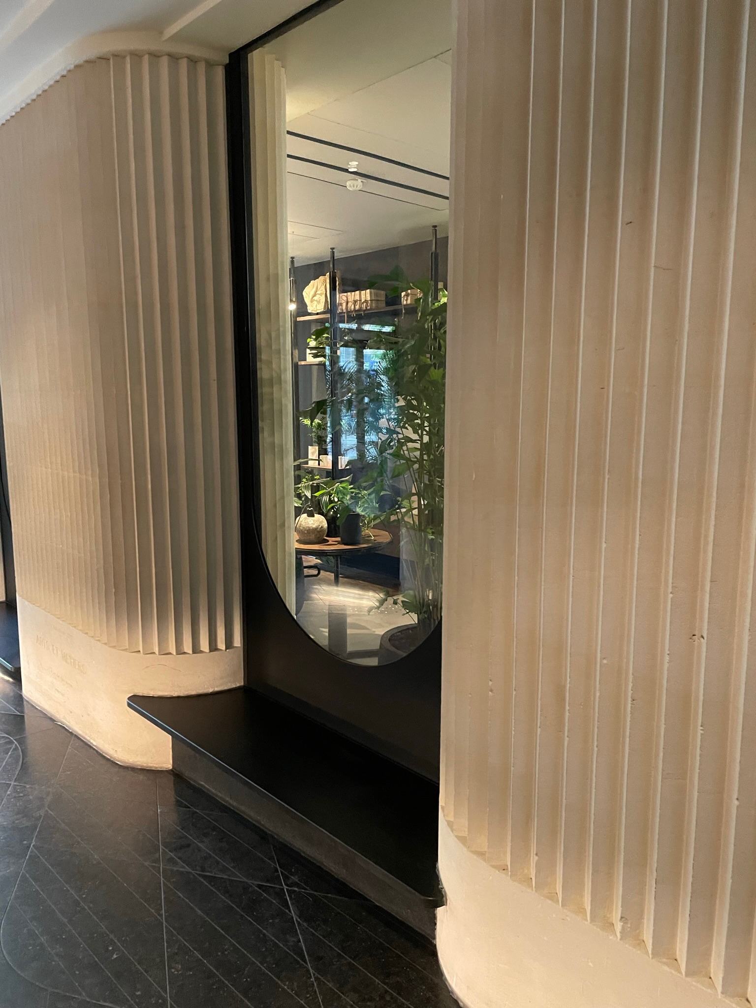 I recently had the pleasure to interview the French designer Raphael Navot for our “What Inspires Me” series (his interview can be found on our website). I was so looking forward to seeing two places that he designed in Paris: a restaurant and a hotel. My Paris-based colleague Stephanie joined me for lunch at Le 39v. The first thing I did was go straight to the outdoor balcony that wraps around the interior open courtyard as I wanted to see the large olive tree that Raphael suspended out into the open-air courtyard. He called this an “inverted panorama” as the focus is now on this floating tree and not on the surrounding views of Paris. Back inside the restaurant, the whole place had a sculptural feel to it with rounded soft walls, curving seating areas, tactile materials coupled with natural materials including the geometric end grain flooring that he also designed. It felt like a place that enveloped you like a soft cocoon and at the same time was very futuristic. One’s senses are heightened through the delicious food combined with the incredible design surrounding you. It is so unique and really is a special place.